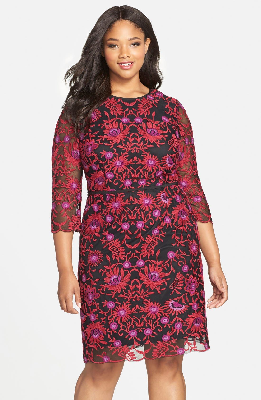 Embroidered Lace Sheath Dress: Hem falls below the knee.